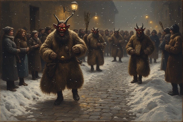 Bei uns in den Alpen kam der Krampus mit dem Nikolaus und der war ein ganz anderes Kaliber. Ganz in Fell gekleidet, mit klirrenden Ketten und Kuhglocken umhangen, teuflischen Hörnern und einer unheimlichen Fratze, aus der hechelnd eine Zunge hing.